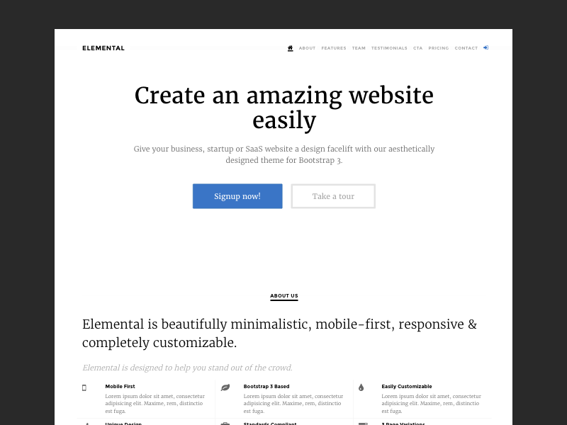 Elemental is a clean, elegant, minimal & beautiful landing page template for Bootstrap 3. It is suitable for design agencies, personal portfolios, startup, app (SaaS) & business landing pages.